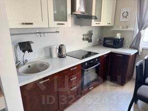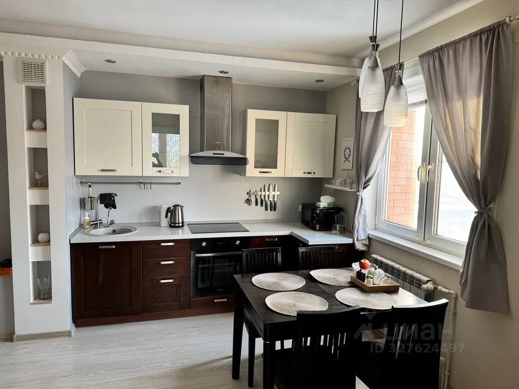 Техника: холодильник, встроенная электрическая индукционная плита, вытяжка над плитой, духовой шкаф, СВЧ, чайник, ТВ, стиральная машина, водонагреватель. Посуда для приготовления и приема пищи