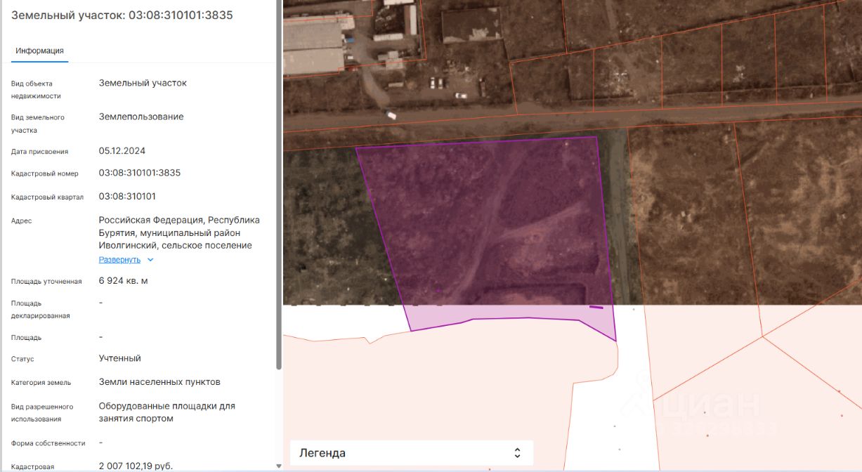 площадью 6 924 кв.м.; категория земель земли населенных пунктов; кадастровый номер земельного участка 03:08:310101:3835; местоположение: Российская Федерация, Республика Бурятия, муниципальный район Иволгинский, сельское поселение Сотниковское, село Сотниково; разрешенное использование оборудованные площадки для занятия спортом;