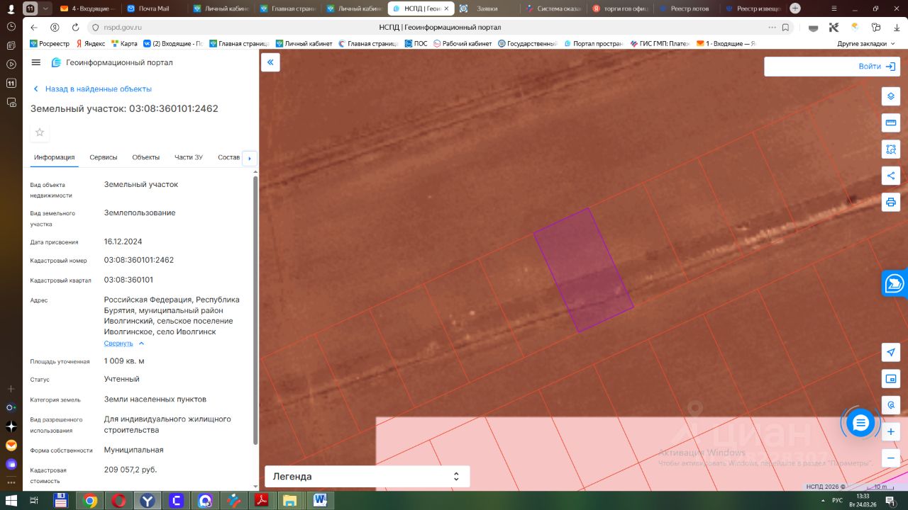 Земельный участок с кадастровым номером 03:08:360101:2462 площадь 1009 по адресу Российская Федерация, Республика Бурятия, муниципальный район Иволгинский, сельское поселение Иволгинское, село Иволгинск