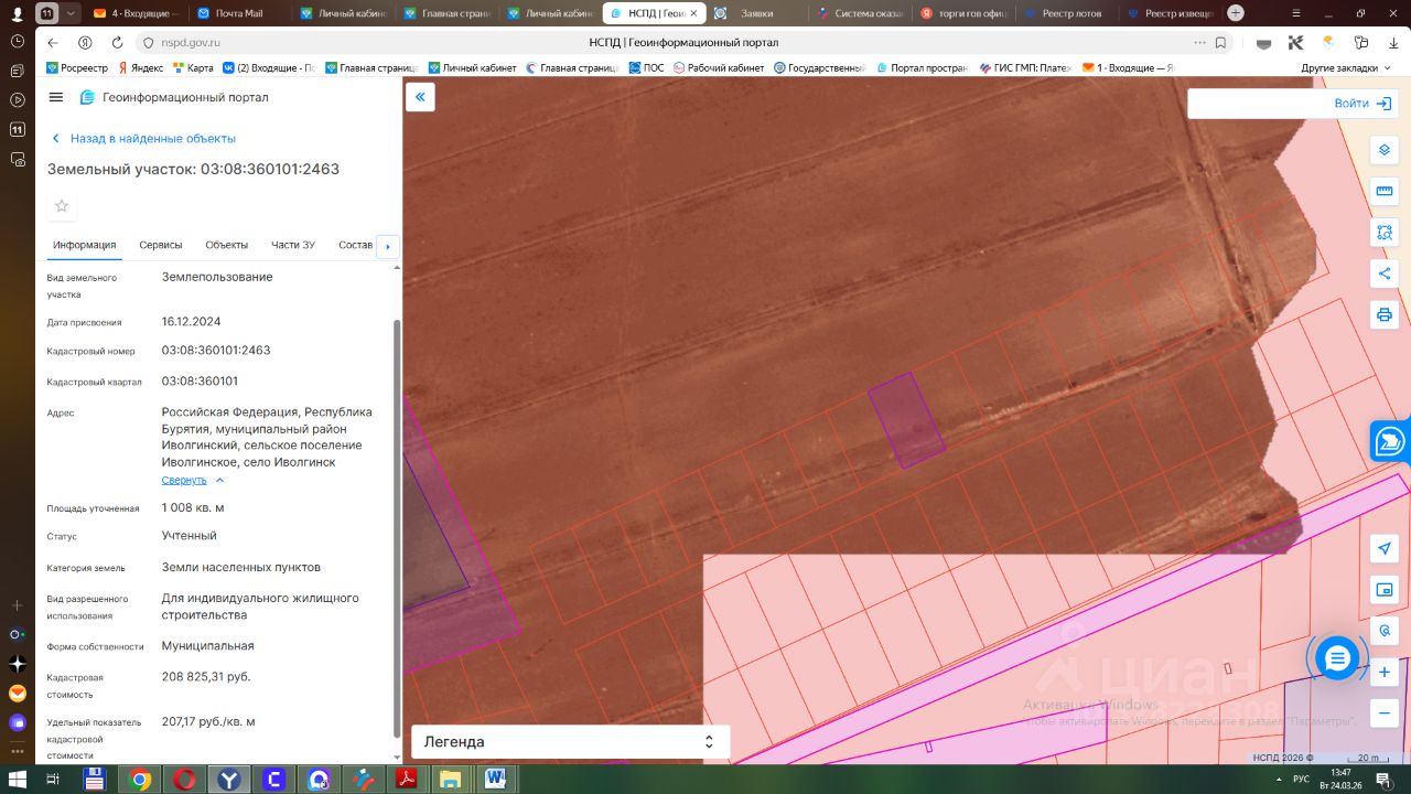 Земельный участок с кадастровым номером 03:08:360101:2463 площадь 1008 по адресу Российская Федерация, Республика Бурятия, муниципальный район Иволгинский, сельское поселение Иволгинское, село Иволгинск