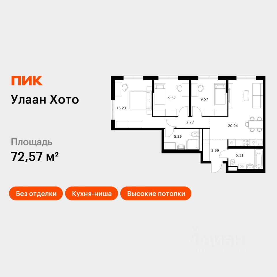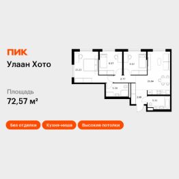 Продаётся 3-комн. квартира площадью 72,57 кв.м на 1 этаже 16 этажного дома (Корпус 2, Секция 1) проекта ПИК Улаан Хото. Светлый просторный подъезд на уровне земли, функциональная планировка, большие окна, без отделки.