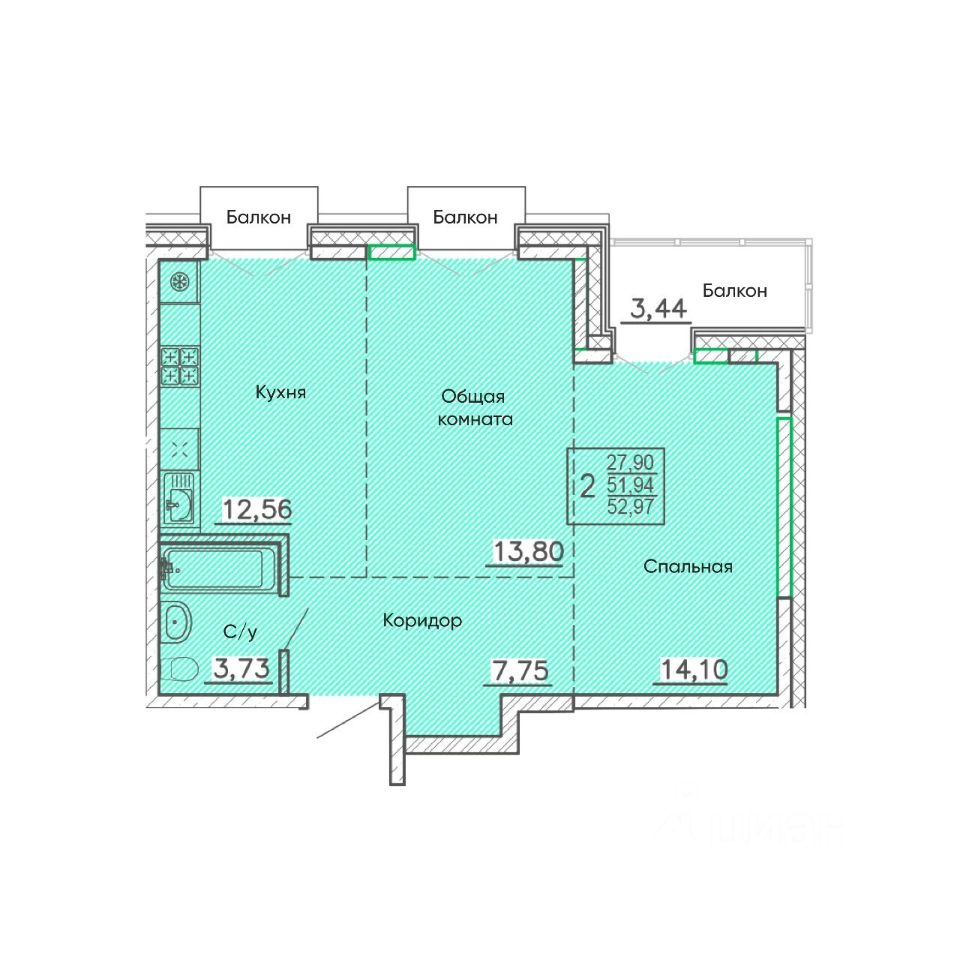 Общая площадь52,97 м²