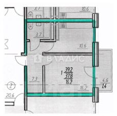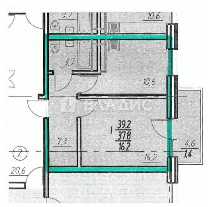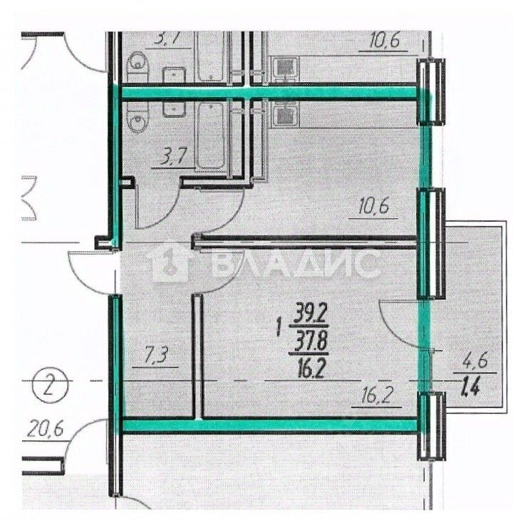 Площадь - 37,8 кв. м, кухня - 10,6 кв. м