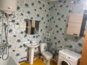 6. Санузел (совмещенный, просторный): ванная, унитаз, раковина, стиральная машина INDESIT, водонагреватель, подвесной шкаф с зеркалом + разные полочки