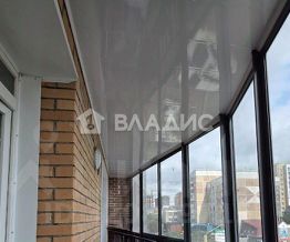 Балкон длиной на ширину гостиной и спальни, остеклен, с видом на улицу.
