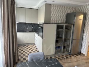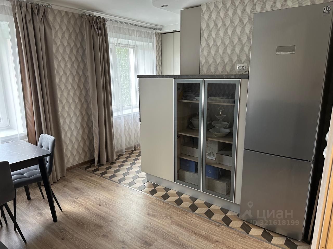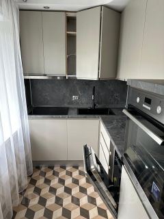 Кухня-гостиная со встроенной техникой и мебелью: духовой шкаф, варочная панель, посудомоечная машина, вытяжка, холодильник, телевизор (в упаковке), диван, большой кухонный стол и стулья. Пол кафель (Керама марацци) и ламинат.