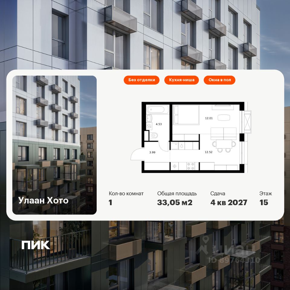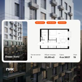 Продаётся 1-комн. квартира площадью 33,05 кв.м на 15 этаже 16 этажного дома (Корпус 2, Секция 1) проекта ПИК Улаан Хото. Светлый просторный подъезд на уровне земли, функциональная планировка, большие окна, без отделки.