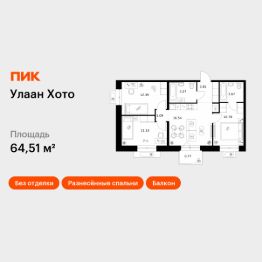 Продаётся 3-комн. квартира площадью 64,51 кв.м на 5 этаже 9 этажного дома (Корпус 1.2.2, Секция 2) проекта ПИК Улаан Хото. Светлый просторный подъезд на уровне земли, функциональная планировка, большие окна, без отделки.
