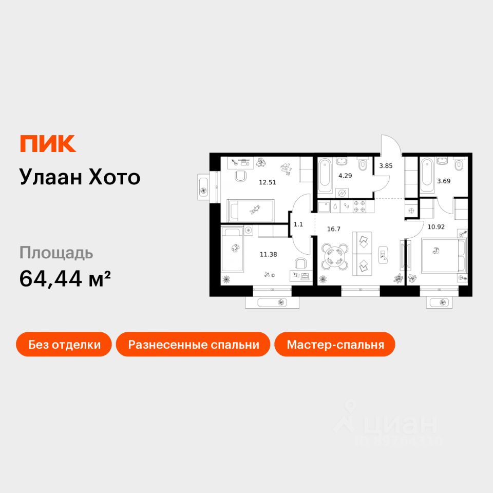 Продаётся 3-комн. квартира площадью 64,44 кв.м на 6 этаже 9 этажного дома (Корпус 1.2.2, Секция 2) проекта ПИК Улаан Хото. Светлый просторный подъезд на уровне земли, функциональная планировка, большие окна, без отделки.