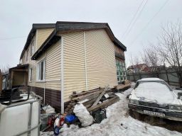 Деревянный дом 1990 года постройки, обшит сайдинговыми панелями. Удобная планировка квартиры. Изолированные жилые комнаты общей площадью 41,4 кв. м, кухонная зона площадью 10,1 кв. м, два совмещенных санузла и подсобные помещения. Состояние квартиры удовлетворительное, ремонт не требуется. Инженерные коммуникации централизованные: водоснабжение, отопление, электроэнергия, канализация. На прилегающей территории расположены подсобные постройки и гараж.