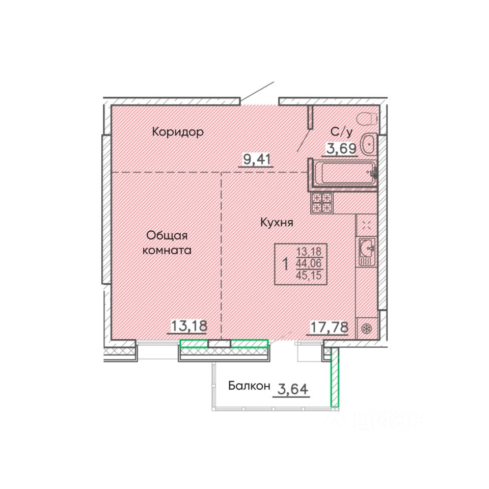 Общая площадь45,15 м²