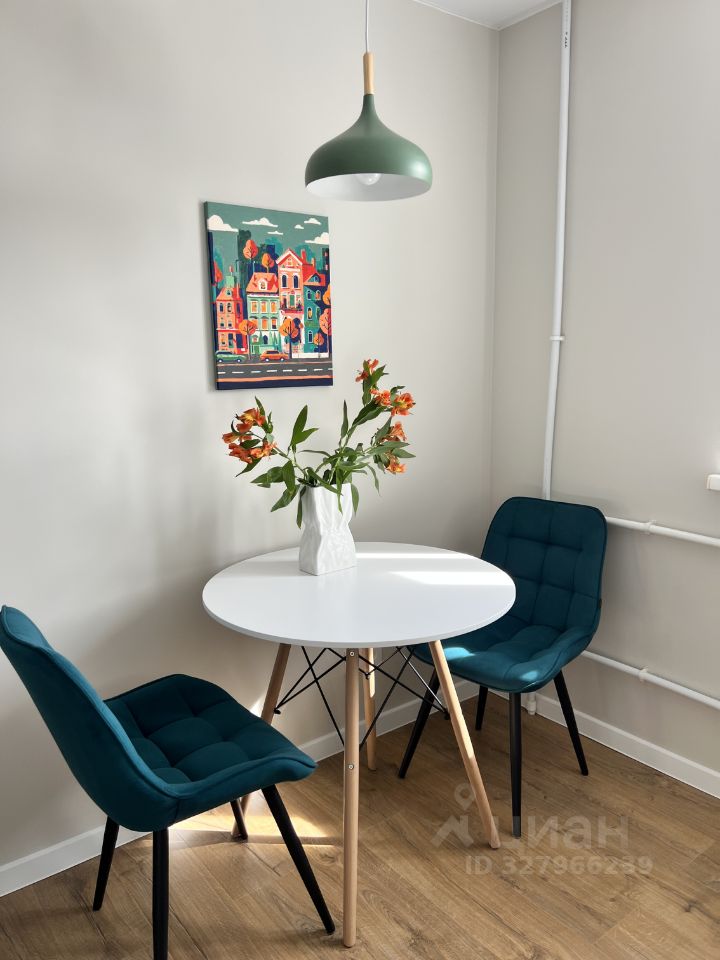 Кухня оборудована современной мебелью и техникой, включая стильный зелёный гарнитур и встроенную плиту. В совмещённом санузле установлена современная сантехника и качественная отделка.