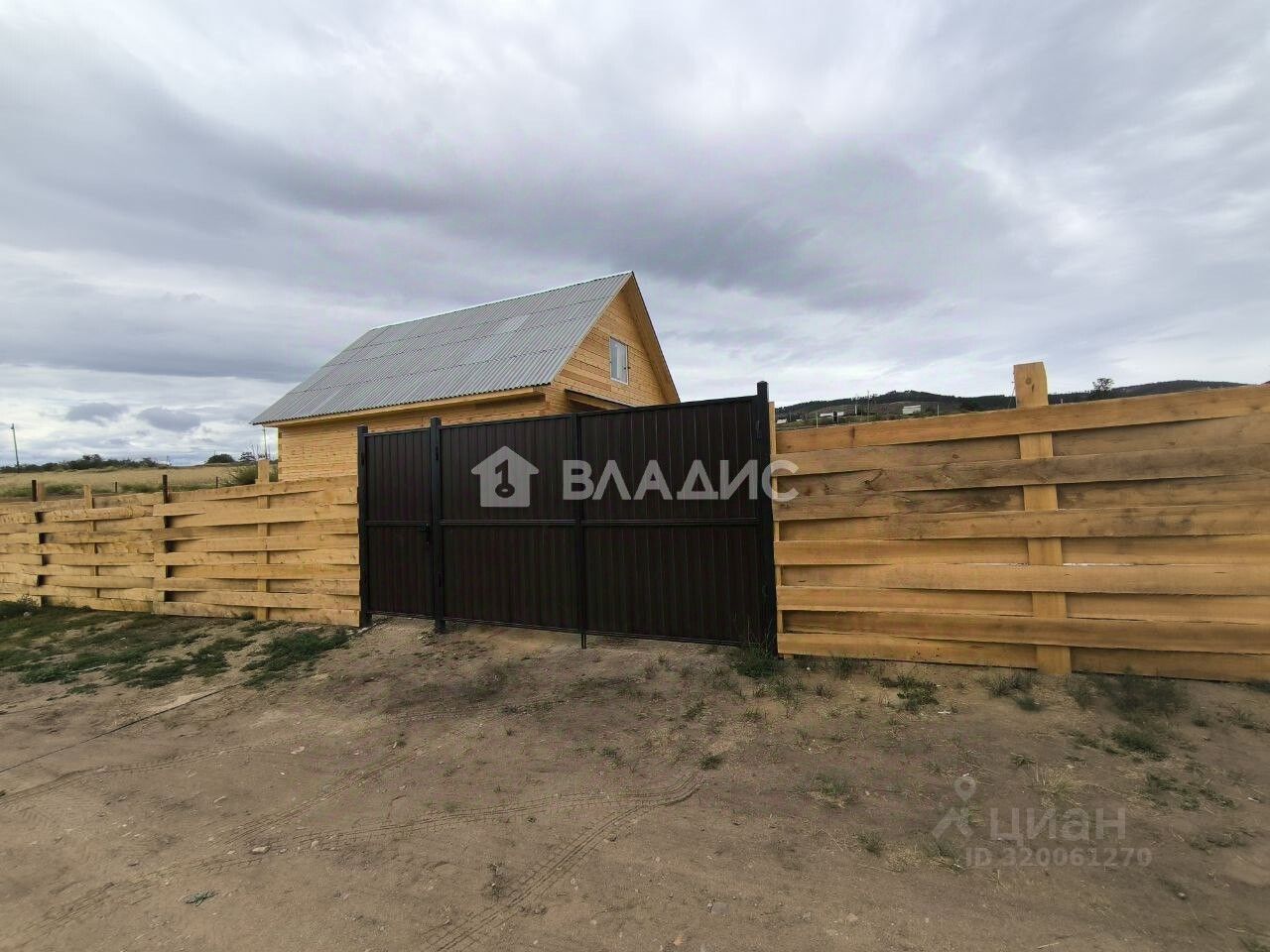 Забор по периметру деревянный, ворота и калитка из профлиста цвета шоколад.