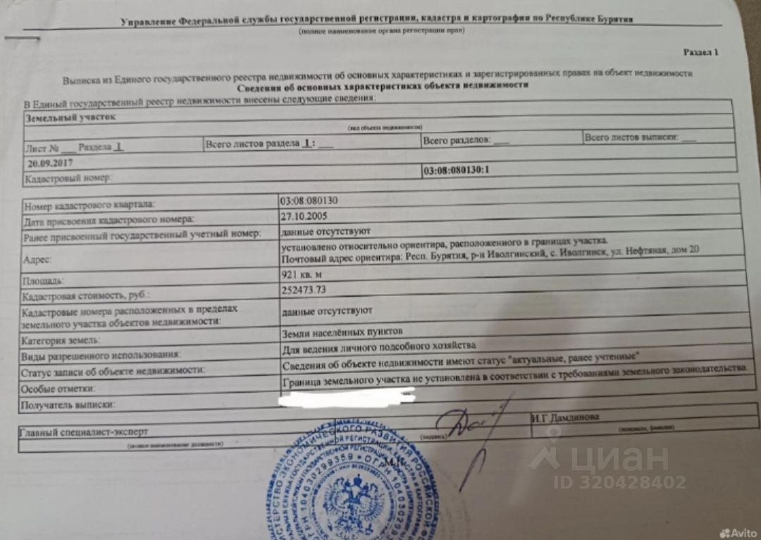 Кадастровый номер участка 03:08:080***30:*** указал продавец