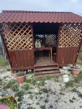 На участке стоит большая беседка, теплица, туалет и ворота железные.